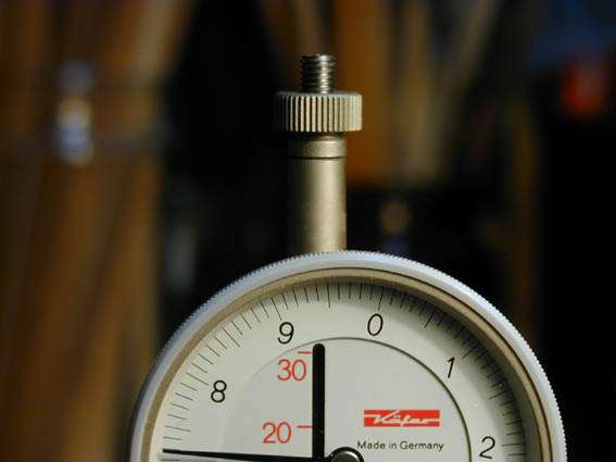 - 上写真はヴァイオリン製作においてはごく一般的なシュネルメッサー(精密厚み測定器)です。このシュネルメッサーを若干改良するだけで、「精密等厚線引き」が出来上がります。まず行うことは、計測器の主軸にネジを切ることです。改良するための具体的なテクニックをこの場で書いていてはきりがないので、この場においては最低限にします。