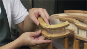 J.カントゥーシャ氏の製作理論の特徴である分解式フォルム(内枠)です。この複雑な構造の分解式フォルムを使うことで、表板側のライフェン(横板内張り)を接着した後にフォルムを外すことができます。これによって、フォルムを外した後にも横板にほとんど歪みが出ない、精度の高い製作を行うことが可能になるのです。