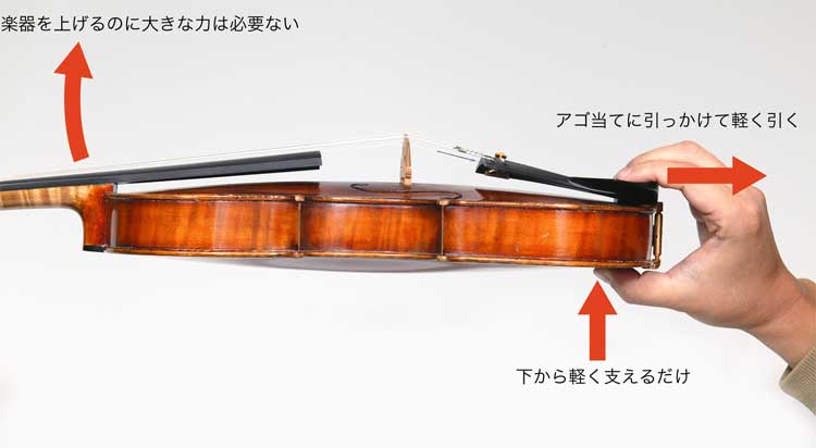 このようにすることで、自然と「楽器を支える支点」、「アゴ当てを引っかける横向きの力」が生まれます。上でも述べましたように、この2つの力がきちんと働いていると、楽器を持ち上げるのにほとんど力は必要ないのです。逆に、楽器を下げようと思っても下がらないくらいです。