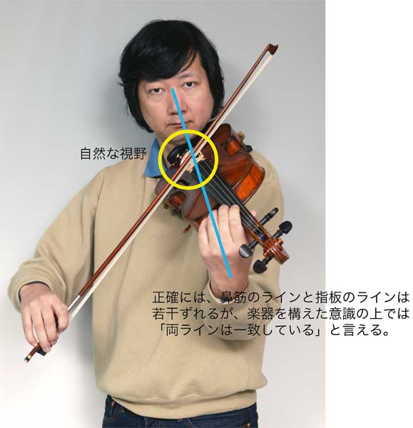 パターン2の持ち方が良くない次の理由は「視野」の位置です。人間は自然な視野の範囲で良い仕事(高度で効率的な仕事)ができるのですが、楽器を回転させてしまうと、駒の位置が自然な視野から外れてしまいます。横目で見ると見えるのですが、これでは高度な仕事がし難くなってしまうのです。