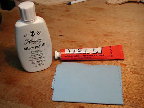 先にも述べましたように弓に使用される金属にはいくつか種類がありますから、正確にはその金属専用の「磨き剤」を使うのですが、基本的には「銀磨き剤」を使います。この薬品は特別なものではなく、DIYショップにおいてごく一般的に売っています。特に彫金コーナーに置いているはずです。