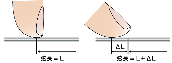 実際の演奏では下図のように、指を立てたり寝かせたりすることによって(チェロの場合には指を横に転がすので、下図とは指の向きが異なります)、弦を押さえる位置が微妙に変わり、弦長にΔLだけの変化が生まれます。これが音程(周波数)の変化に結びつくわけです。ヴァイオリンのヴィブラートの基本は(最初でも書きましたように、様々なヴィブラート技法があるので、一概には言えないのですが)、目的の音程からΔLだけ弦長を伸ばし、音を低い側に震わせます。周波数で表現すると、f ~ (f-Δf)の範囲でヴィブラートがかけられます。