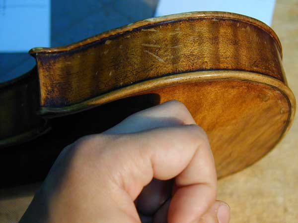 この事をご存じの方は少ないと思います。楽器のf孔の形によりますが、写真のようにf孔の上(下)の角張った箇所の隙間が狭い場合には、長年に渡りそこに松ヤニとゴミが付着して、この隙間が繋がってしまっていることも多いのです。この様になっていると、ゴミ(松ヤニの塊)とf孔側面との間で雑音が生じてしまうこと多いのです。