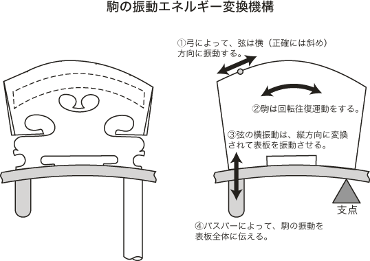 魂柱、すなわち「支点」を駒に近づけることにより、駒の振動を大きく増幅して、表板を振動させることができます。しかし逆に言えば、駒は素直な振動をにくくなります。こうすると高い倍音成分が出やすくなります。
