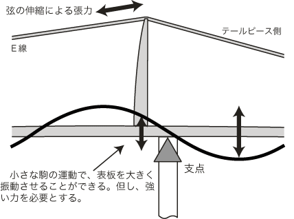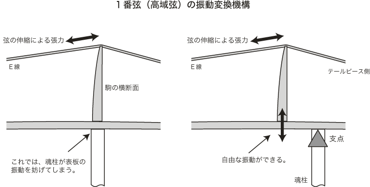 魂柱を外側に立てると、支点と力点の距離が大きくなります。従って、弦は軽い力で駒を回転運動させることができます。これはすなわち、音の発音がなめらかになるということを指します。