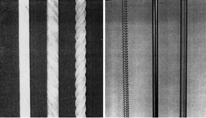 弦製作家は、2つの吊り金具の間にこの膜状物質をぴんと張る(この時これは、とても素晴らしい繊維に見える)。この仕事は、最終的な弦の直径に大きく関わってくるのである。それから一方の金具の方から、もう一方へ線を折り曲げ、それをよじりながら円筒系の形にしていくのだ。これか乾いて滑らかに磨かれると、一般的な(平らな)ガット弦となるのである。
