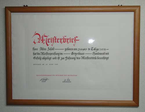 まず最初に念をおしておかなければなりません事は、マイスター資格自体は、「ドイツの職人としての免許状」でしかないということです。まして日本においてマイスター取得者が希少人数しか存在しなかった20年も前のことならば別としても、2000年現在における日本人のヴァイオリン製作マイスター資格取得者が7名(海外在住者は除く。氏名は脚注に記載)にもなった現在において、マイスターという資格自体に希少価値も特別なステータスはありません。